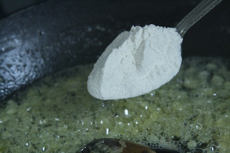 2- دو قاشق آرد را اضافه میکنیم ومرتب هم میزنیم