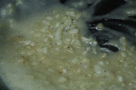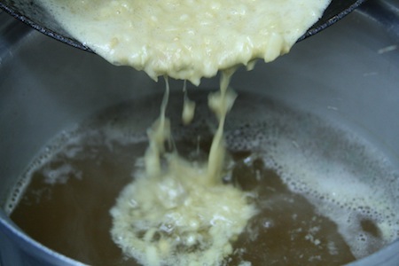 ۳- مواد را به آب مرغ ( همراه با مرغ ریش ریش) اضافه میکنیم