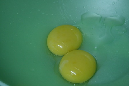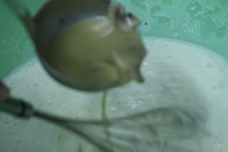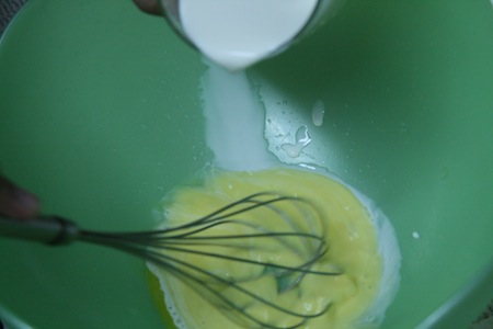 ۵- در ظرفی زرده را میریزیم به همراه شیر و کم کم آب مرغ را اضافه میکنیم