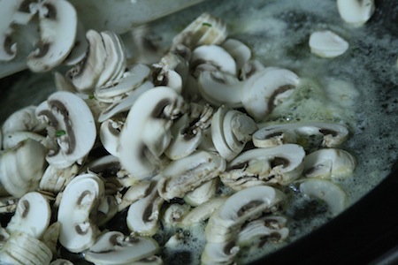 ۴- قارچ را خرد میکنیم و در کمی کره تفت میدهیم و به همراه جعفری به سوپ اضافه میکنیم
