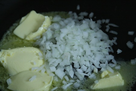 ۱-کره را در تابه میریزیم و پیاز را به آن اضافه میکنیم