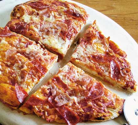آرد و نمک را در کاسه ای الک کنید . مایه خمیر ، شکر ، روغن زیتون ، آویشن و پودر سیر را اضافه و با هم مخلوط کنید .سپس آب ولرم را کم کم اضافه کنید تا به صورت خمیر یکنواختی در آید و به دست نچسبد. سوسیس ، قارچ و زیتون خرد کرده را به خمیر اضافه کرده ورز دهید تا با خمیر مخلوط شود . کف سینی را چرب کرده و خمیر را داخل آن پهن کنید سپس تخم مرغ زده شده را روی خمیر بمالید. خمیر را استراحت داده تا ور بیاید سپس گوجه فرنگی و فلفل دلمه ای را روی آن ریخته و در انتها پنیر رنده شده را روی آن بپاشید و آن را در فر با حرارت 250 درجه سانتی گراد بگذارید تا بپزد.